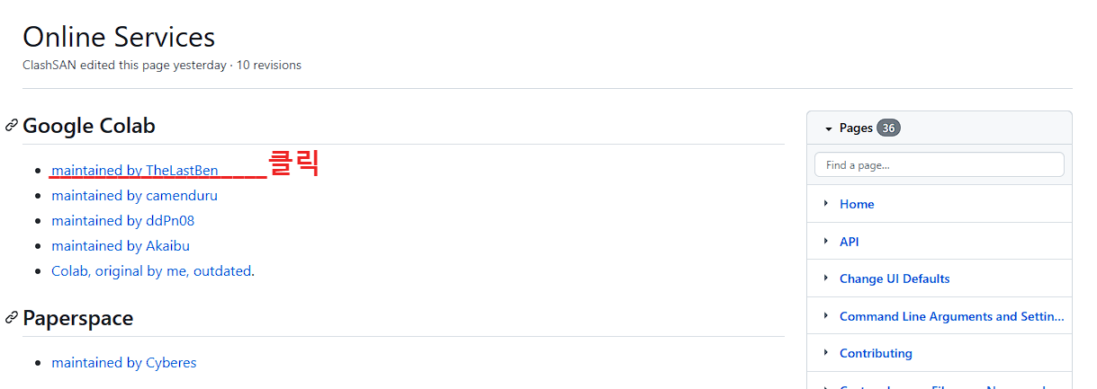 List of Online Services를 클릭하면 다음과 같은 화면이 나옵니다. 'Google Colab' 을 찾으시고 첫 번째 줄에 있는 'maintained by TheLastBen' 링크를 클릭하세요.