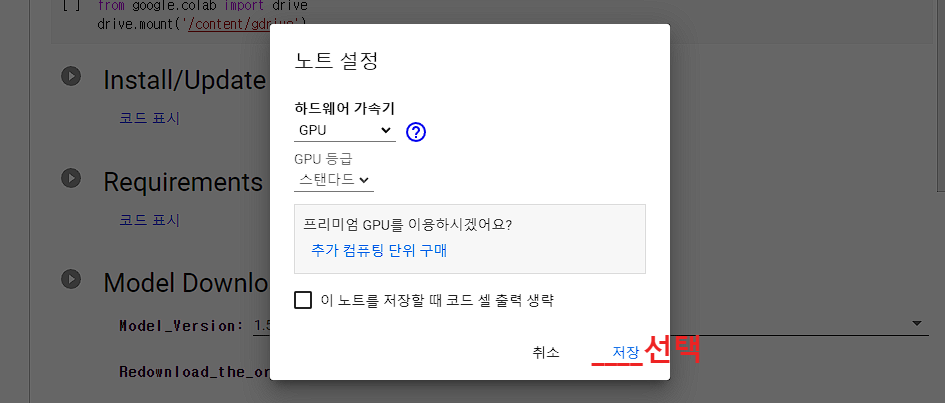 상단의 런타임을 클릭해서 나타나는 메뉴 중 '런타임 유형 변경'을 선택합니다. 그러면 '노트 설정'창이 나타납니다. 하드웨어 가속기에서 GPU를 선택하고 하단의 '저장'을 클릭하세요.